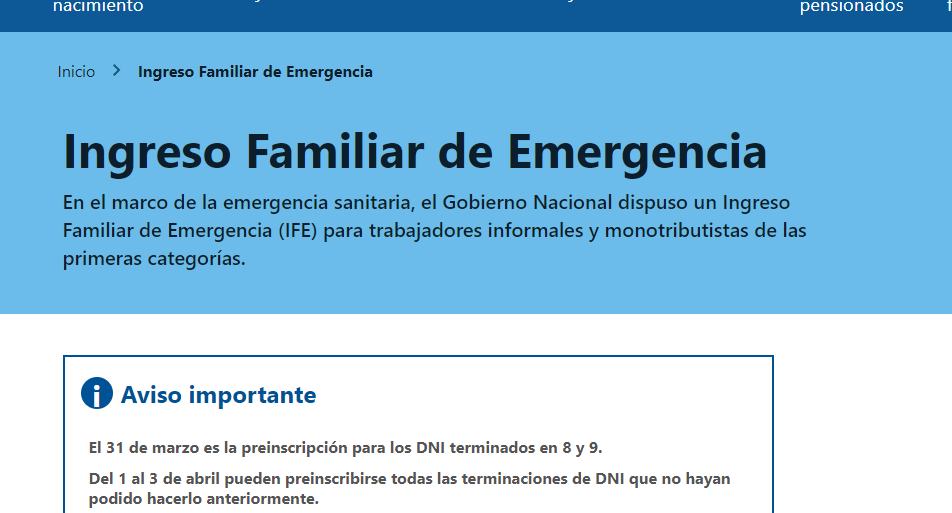 La ANSES informa que la pre-inscripción para percibir el Ingreso Familiar de Emergencia (IFE) se extiende hasta el viernes 3 de abril para todas las terminaciones de DNI.