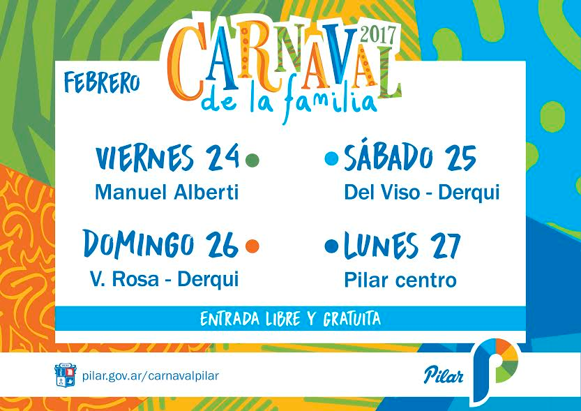 La Secretaría General del municipio confirmó hoy las fechas y lugares donde se realizarán los festejos del Carnaval de la Familia 2017. Se llevará a cabo los días 24, 25, 26 y 27 de febrero en cinco localidades; Manuel Alberti, Derqui, Del Viso, Villa Rosa y Pilar.