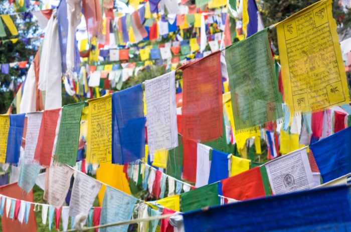 Simbolismo de los colores En las telas de los banderines tibetanos se utilizan los cinco colores tradicionales (azul, blanco, rojo, verde y amarillo). El orden de colores se mantiene en cualquier versión de los banderines. Estos representan los 5 elementos: