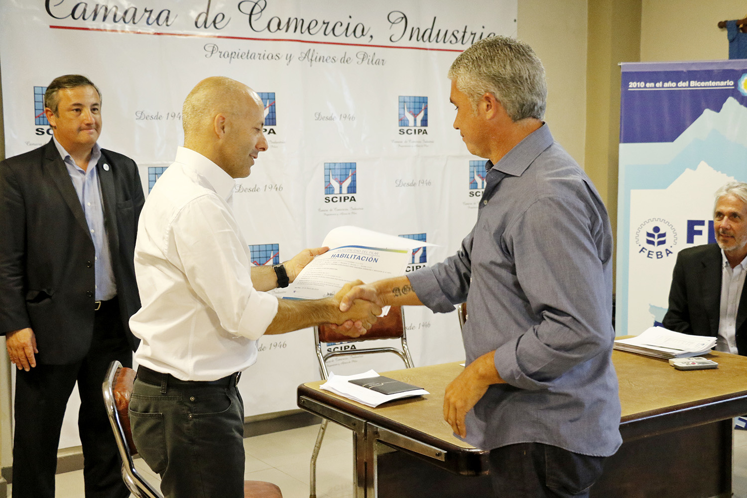 El intendente Nicolás Ducoté entregó habilitaciones definitivas a comerciantes de Pilar, en la sede de la Sociedad de Comerciantes, Industriales Propietarios y Afines (SCIPA). El jefe comunal estuvo acompañado por el subsecretario de Desarrollo Económico, Guillermo Lindoso.