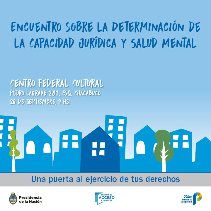 El próximo 20 de septiembre a partir de las 9 horas en el Centro Cultural Federal, ubicado en Pedro Lagrave 281, se llevará a cabo el “Encuentro sobre la Determinación de la Capacidad Jurídica y Salud Mental”, actividad organizada por el Centro de Acceso a la Justicia de Pilar, dependiente del Ministerio de Justicia de la Nación y la Dirección de Discapacidad local.