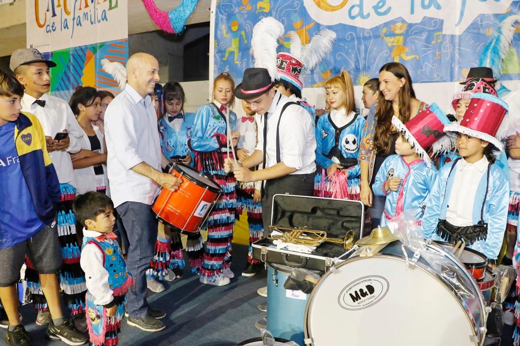 Durante el acto, desarrollado en el Microestadio Municipal Ricardo Rusticucci, se invitó a representantes de cada murga a pasar y probar los instrumentos, dándole ritmo a la actividad.