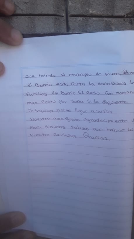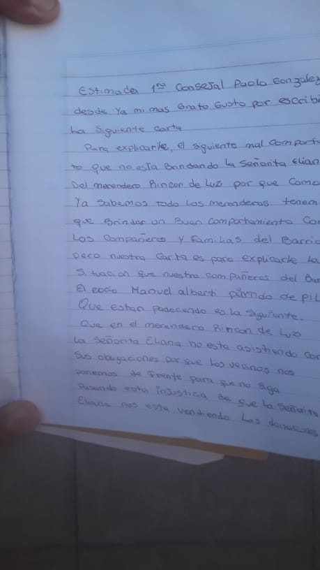 «No nos quieren recibir la carta con las firmas de los vecinos porque nos dicen que tiene que ser más formal, por computadora, pero nosotros no tenemos, somos gente de barrio. Lo único que pedimos es que no le den más la comida a esa señora que maneja el comedor que quiere hacer negocio», Pablo, fue el vecino que intentó dejar la carta en Desarrollo Social del Municipio y relató por qué no se la recibieron.
