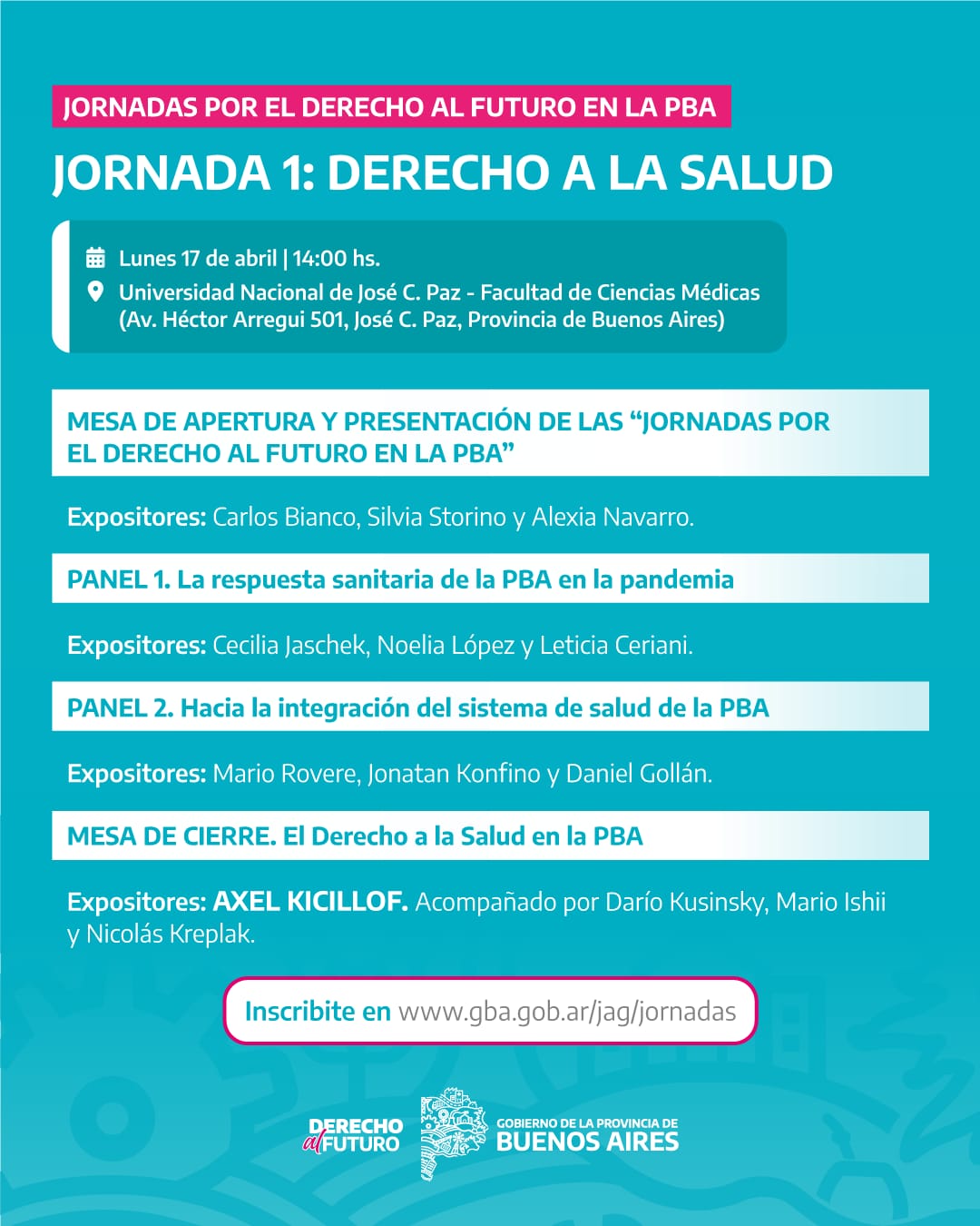 El Gobierno bonaerense dará inicio este lunes 17 de abril al ciclo de Jornadas por el Derecho al Futuro en la Provincia de Buenos Aires, una serie de encuentros que tienen como objetivo presentar y debatir un conjunto de ejes estratégicos para el desarrollo y la ampliación de derechos para el pueblo bonaerense. La primera jornada, bajo el título “Derecho a la Salud”, tendrá lugar en la Universidad Nacional de José C. Paz (UNPAZ) y contará con la presencia del gobernador Axel Kicillof, el ministro de Salud, Nicolás Kreplak, el intendente de José C. Paz. Mario Ishii y otras autoridades provinciales, municipales y universitarias.
