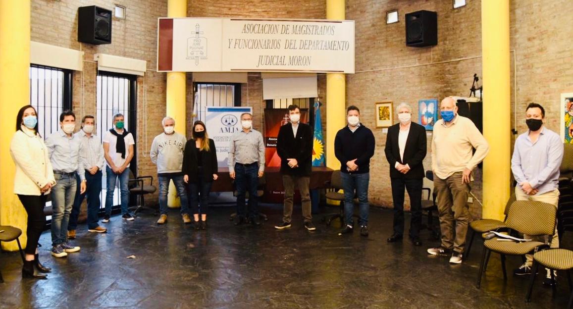 «En un acontecimiento histórico la Asociacón de Magistrados y Funcionarios de Morón recibió la visita de los 4 intendentes que integran nuestro departamento judicial, sres: Lucas Ghi, Alberto Descalzo, Gustavo Menéndez y Juan Zabaleta.