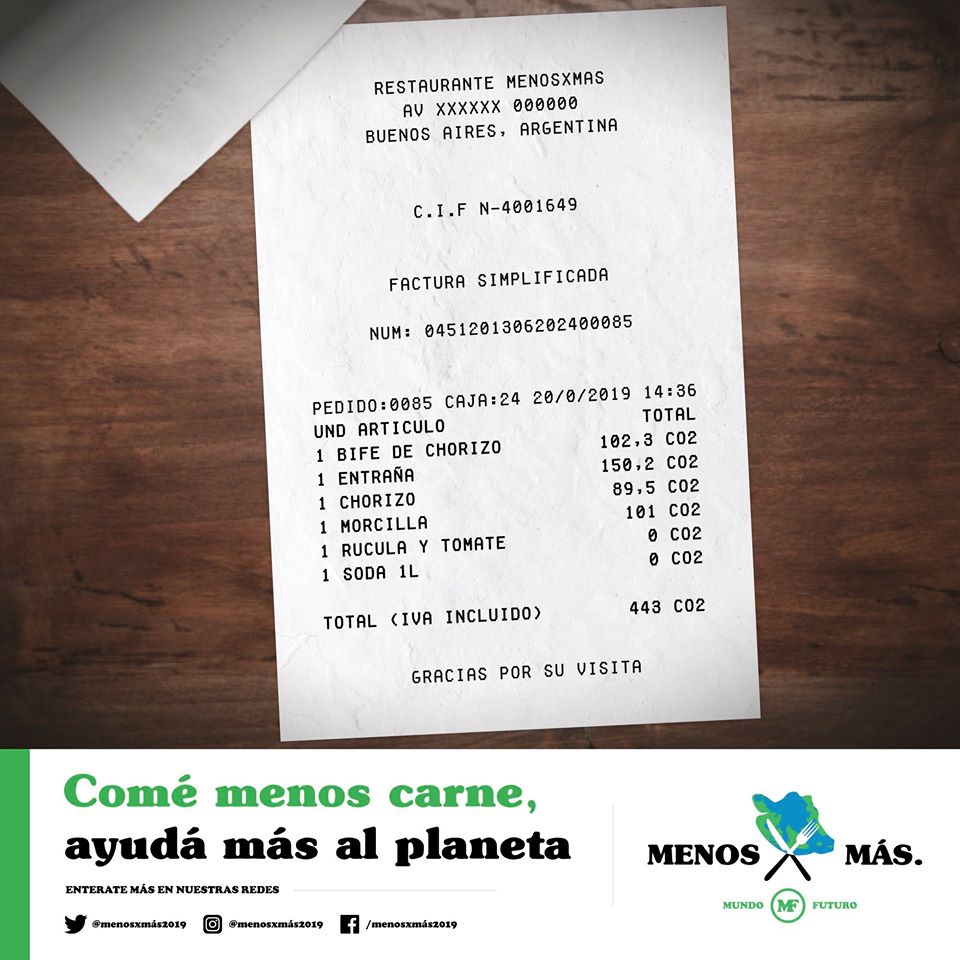 “Mundo futuro” presenta la campaña de bien público “Menos X Más”, una campaña que no busca una eliminación total de la carne de nuestro sistema alimentario, sino una disminución de los elevados (y excesivos) niveles de consumo de la misma. La razón de esta campaña es visibilizar las consecuencias de la contaminación ambiental provocada por la industria ganadera. Creada por un equipo de estudiantes de la carrera Ciencias de la Comunicación Social de la Universidad de Buenos Aires.