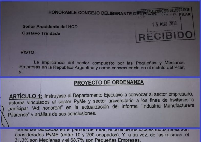 Julian Candermo, profesional dedicado al sector PYME, presentó el proyecto en el Concejo Deliberante y explicó «Este proyecto tiene por objeto realizar un relevamiento del estado actual de la Pequeña y Mediana Empresa Pilarense, con base a un estudio realizado por la Fundación Observatorio PyME y la Università di Bologna en el 2009.»