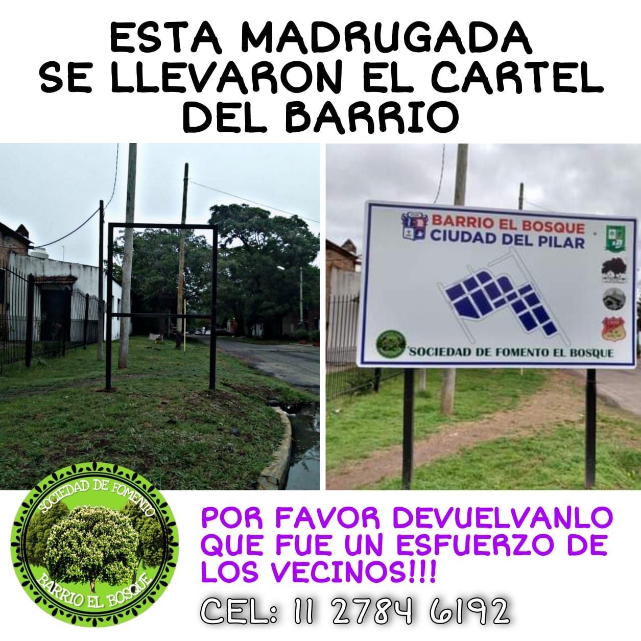 Robaron el cartel de barrio El Bosque, el día en que la Soc. Fto. cumple un año